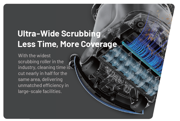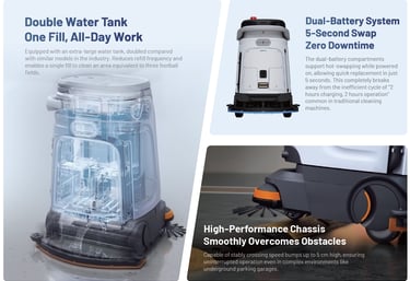 Double Water Capacity, 50% Longer Full-tank runtime Supports 10-hour high-intensity cleaning from night to morning shifts. A single full tank covers at least 20,000㎡.