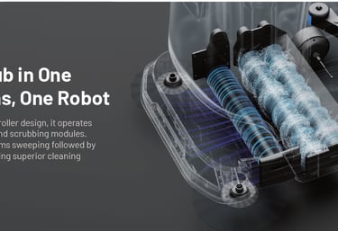 Integrated Sweeping and Washing, Effective Removal of Heavy Stains. Featuring a pioneering triple-roller design, it operates with independent sweeping and scrubbing modules. This integrated system performs sweeping followed by scrubbing in one pass, delivering superior cleaning efficiency and performance.